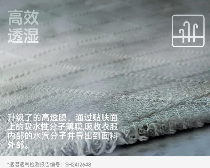高效透湿透气膜面料吸附水性分子导出到面料外,减少湿冷感,透湿率≥4000g/m2·24h