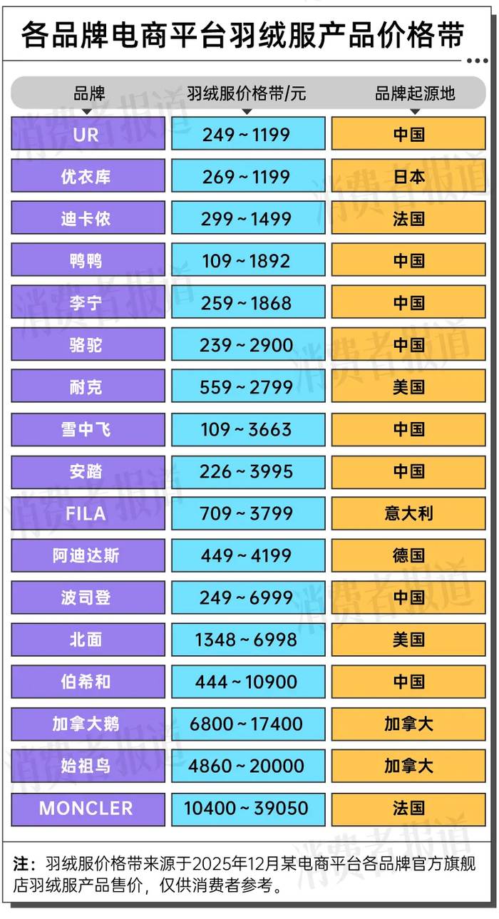 国内羽绒服消费市场呈现出“国际品牌向下,国产品牌向上”的品牌格局变化态势。《消费者报道》记者近日统计了目前电商平台上各品牌羽绒服产品价格情况,发现羽绒服高端价格带仍由国际品牌占据,如Canada Goose(加拿大鹅)、ARC"TERYX(始祖鸟)、MONCLER(盟可睐)等;中低端价格带由国产品牌占据,如鸭鸭、李宁、骆驼、安踏等。不过,这种格局并非一成不变的,不仅国际品牌有向下拓展的需求,国产品牌亦有向上进攻的趋势。