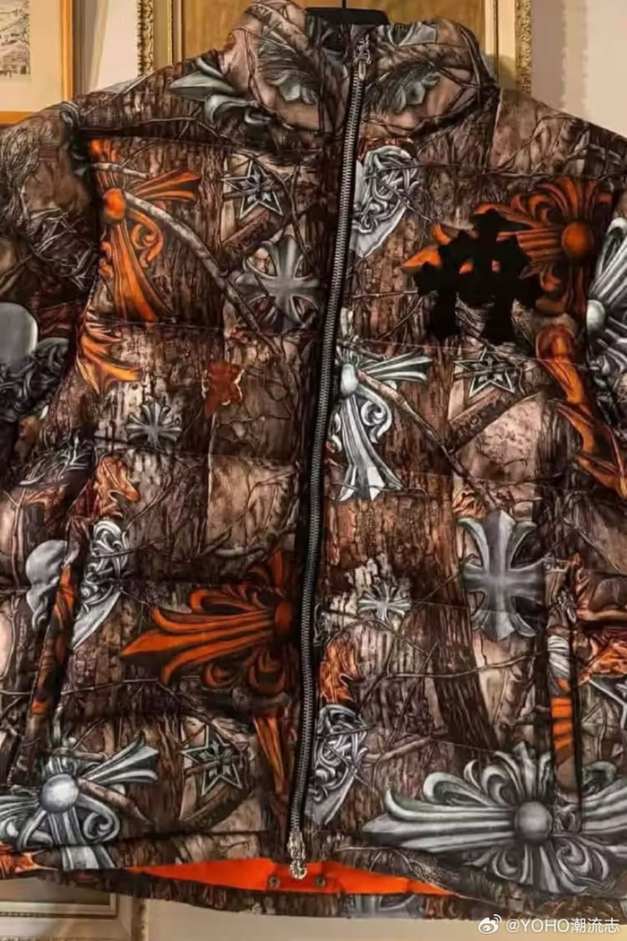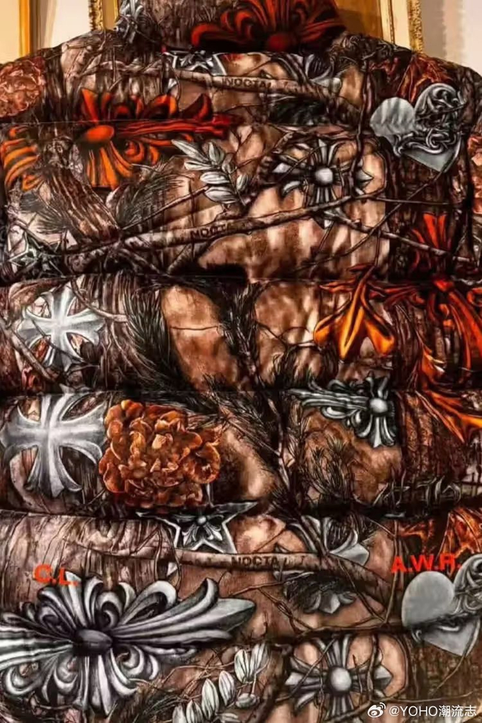 本次Nike NOCTA x Chrome Hearts 联名的灵魂核心,无疑是一件定价高达39,000 美元的羽绒外套。设计上选用特别订制的Realtree 迷彩作为基底,但整体视觉早已跳脱户外语汇,而是将迷彩元素全面转化为Chrome Hearts 标志性的十字图腾。外层透过顶级义大利皮革进行压纹与雕刻处理,细节层次极为繁复,搭配纯银匕首拉链与满布十字符号的金属钮扣,直接把这件外套拉升至「投资等级单品」的高度。