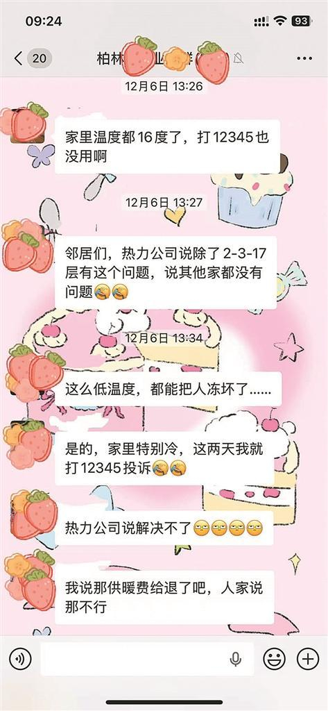为了让屋子尽快暖起来,这几年,韩女士找了多个部门,“我打过12345民生热线,没解决;我找过供热公司,供热公司说我家泵坏了,我换了泵,结果还是不热,供热公司又说我家水管堵了,疏通之后也排水了,仍然不热。”韩女士说,在这个小区,家里不热的不光她一家,还有一部分居民家的室温不达标。记者在韩女士的手机上看到,微信业主群中,不少业主都在群里说家里很冷,有的还把家里的室温拍照发到了群里。